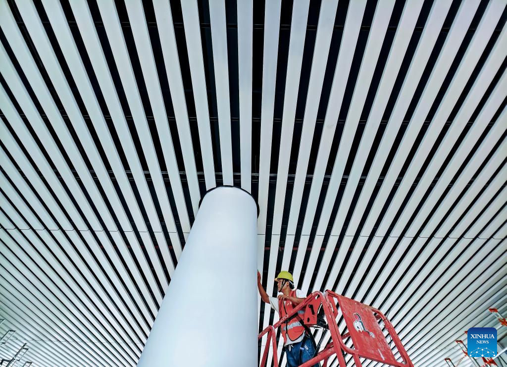 A worker grinds a column at the construction site of Xiang'an International Airport in Xiamen, southeast China's Fujian Province, June 16, 2025. The construction of the airport is expected to be completed by the end of this year. It will be put into operation by the end of 2026. By then, the airport will be able to meet the annual passenger throughput of 45 million people, cargo and mail throughput of 750,000 tonnes, and aircraft take-offs and landings of 380,000. (Xinhua/Wei Peiquan)