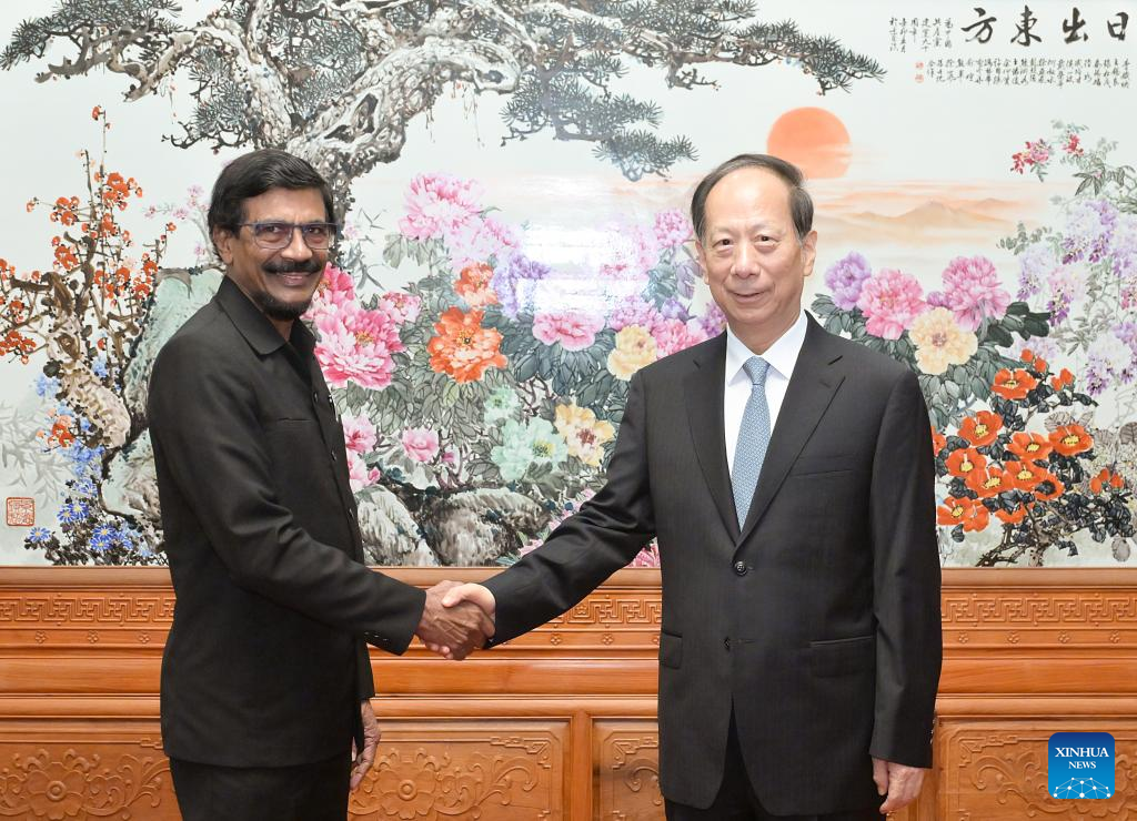 Shi Taifeng, a member of the Political Bureau of the Communist Party of China (CPC) Central Committee and head of the CPC Central Committee's Organization Department, meets with a delegation of senior cadres from Janatha Vimukthi Peramuna (JVP) of Sri Lanka, led by its General Secretary Tilvin Silva, in Beijing, capital of China, June 18, 2025. (Xinhua/Gao Jie)