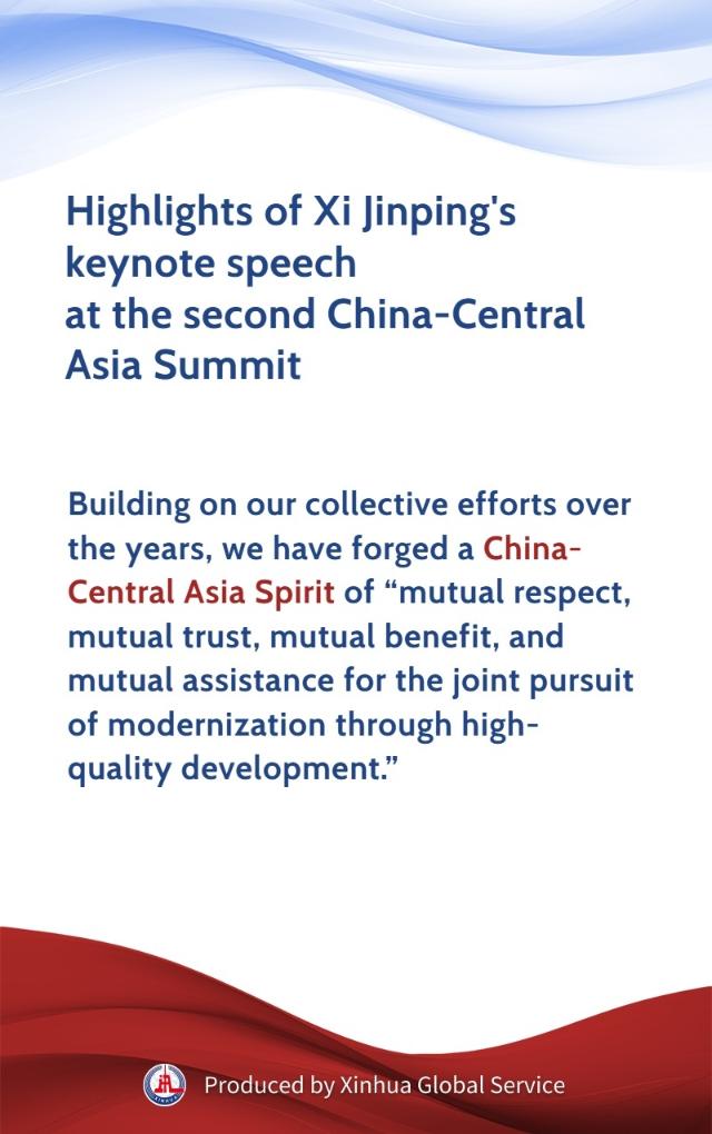China and Central Asian countries have explored and formed the China-Central Asia Spirit, which features mutual respect, mutual trust, mutual benefit, mutual assistance, and the pursuit of common modernization through high-quality development, said Chinese President Xi Jinping at the second China-Central Asia Summit in Astana.