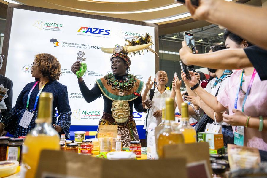 "Look, my friends! The chili oil from Congo is excellent!" At the booth of the Democratic Republic of Congo (DRC), Sembatya William, a popular Ugandan influencer in China, dressed in traditional African clothing and wearing a cow horn, was live selling his country's best products.