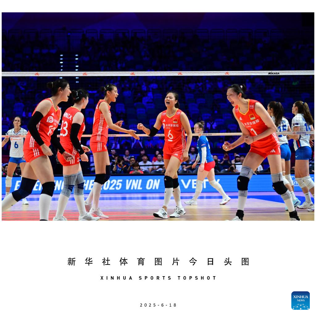 Players of China celebrate scoring during the pool 5 match between China and the Czech Republic at the Women's Volleyball Nations League (VNL) 2025 in Hong Kong, China, June 18, 2025. (Xinhua/Zhu Wei)