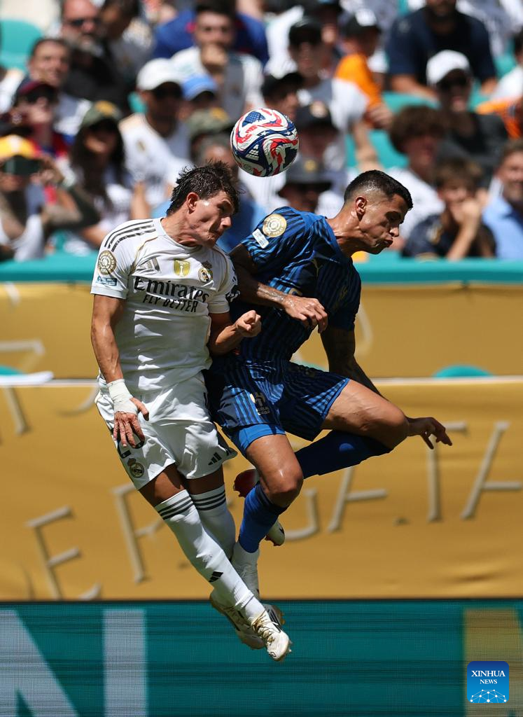 Fran Garcia (L) of Real Madrid and Joao Cancelo of Al Hilal head for the ball during the group H match between Real Madrid C. F. of Spain and Al Hilal of Saudi Arabia at the FIFA Club World Cup 2025 at the Hard Rock Stadium, Miami, the United States, June 18, 2025. (Xinhua/Li Ming)