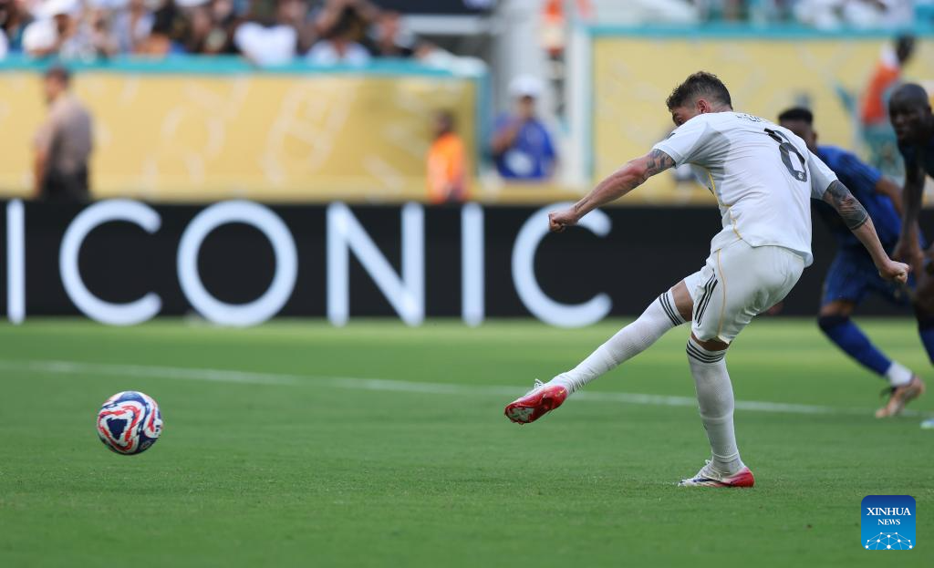 Federico Valverde of Real Madrid takes a penalty kick during the group H match between Real Madrid C. F. of Spain and Al Hilal of Saudi Arabia at the FIFA Club World Cup 2025 at the Hard Rock Stadium, Miami, the United States, June 18, 2025. (Xinhua/Li Ming)