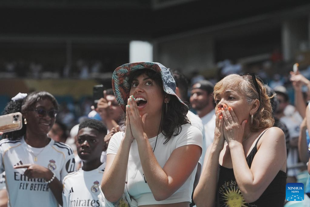 Supporters of Real Madrid cheer during the group H match between Real Madrid C. F. of Spain and Al Hilal of Saudi Arabia at the FIFA Club World Cup 2025 at the Hard Rock Stadium, Miami, the United States, June 18, 2025. (Xinhua/Huang Zongzhi)
