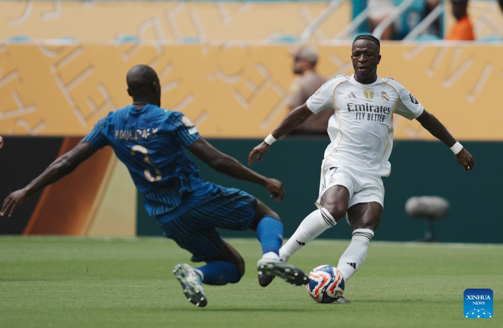 Vinicius Junior (R) of Real Madrid vies with Kalidou Koulibaly of Al Hilal during the group H match between Real Madrid C. F. of Spain and Al Hilal of Saudi Arabia at the FIFA Club World Cup 2025 at the Hard Rock Stadium, Miami, the United States, June 18, 2025. (Xinhua/Huang Zongzhi)