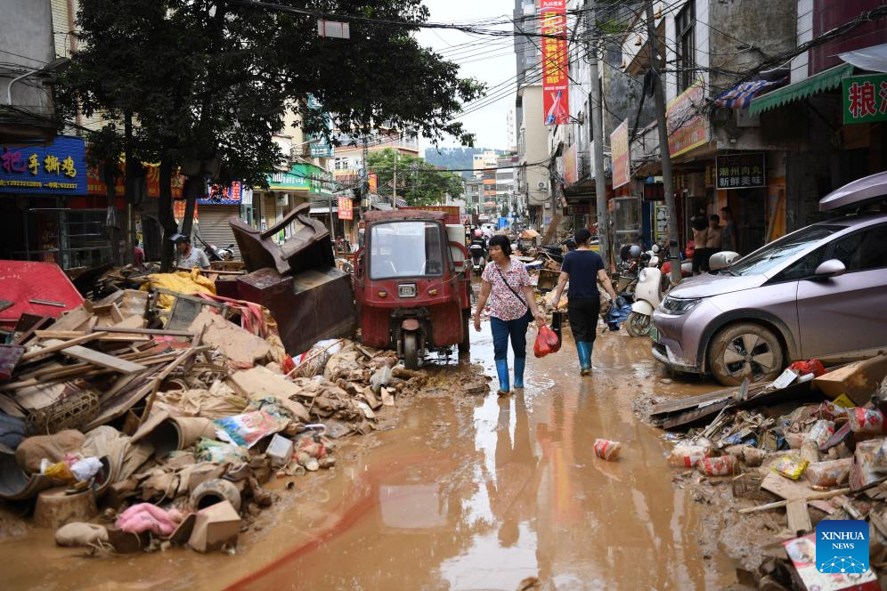 Residents walk on a flood-hit road in Huaiji County, south China's Guangdong Province, June 19, 2025. (Xinhua/Deng Hua)