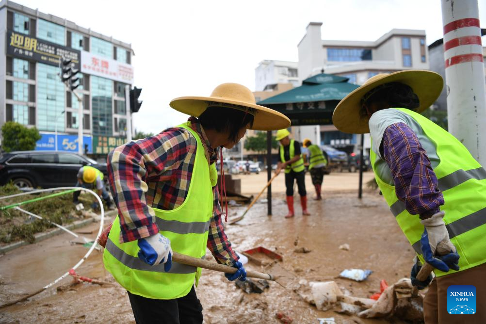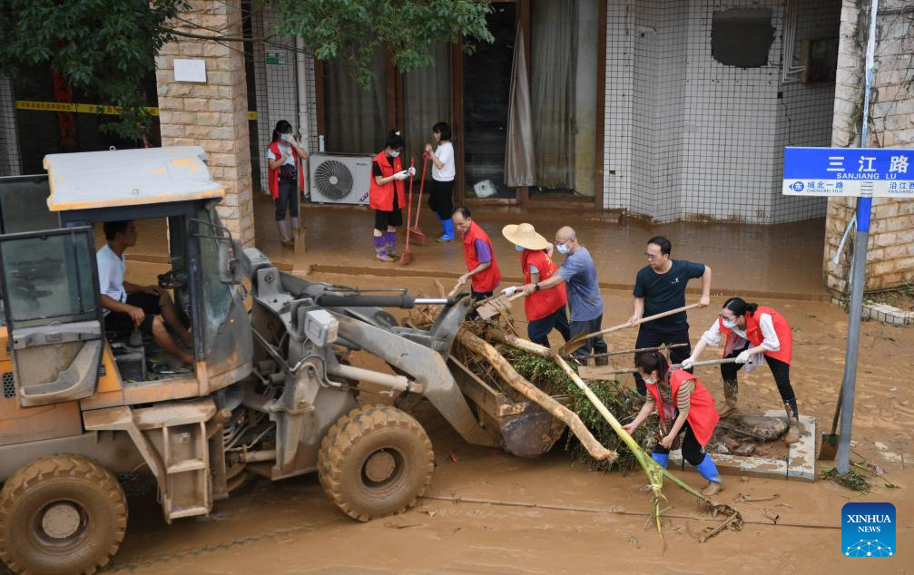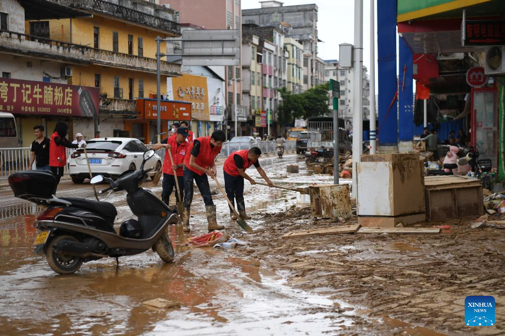 Volunteers clean up a flood-hit street in Huaiji County, south China's Guangdong Province, June 19, 2025. (Xinhua/Deng Hua)