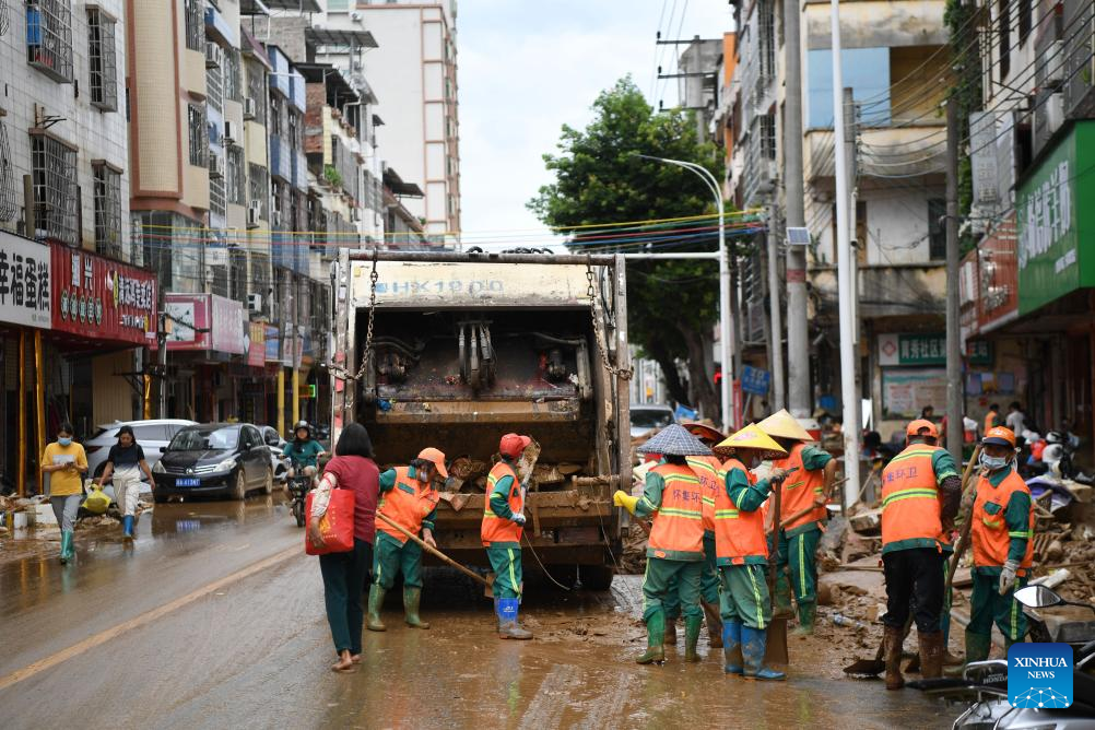 Sanitation workers clean up a flood-hit street in Huaiji County, south China's Guangdong Province, June 19, 2025. (Xinhua/Deng Hua)