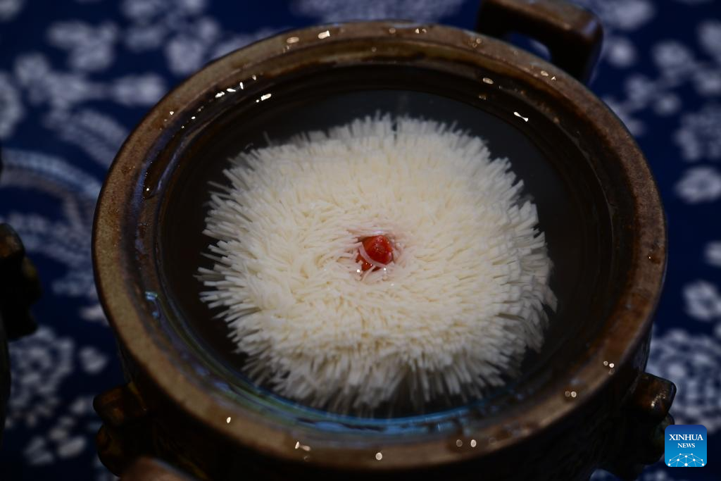 This photo taken on April 8, 2025 shows the "Chrysanthemum-shaped tofu" made by Zhang Shihong, an inheritor of the tofu banquet making skills, in Shouxian County, Huainan City, east China's Anhui Province, For thousands of years, the traditional tofu-making techniques have been carried on from generation to generation in Bagongshan Township of Shouxian County. This technique in 2014 was included in the fourth batch of the national representative list of intangible cultural heritage of China.