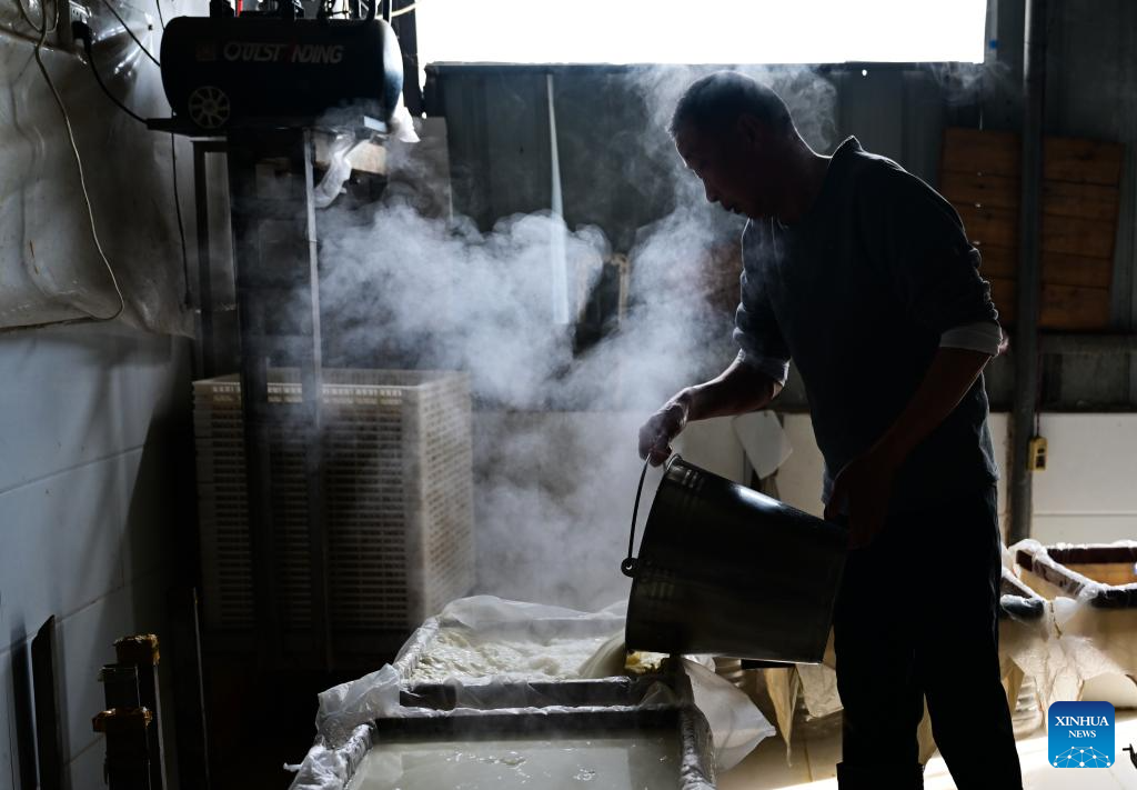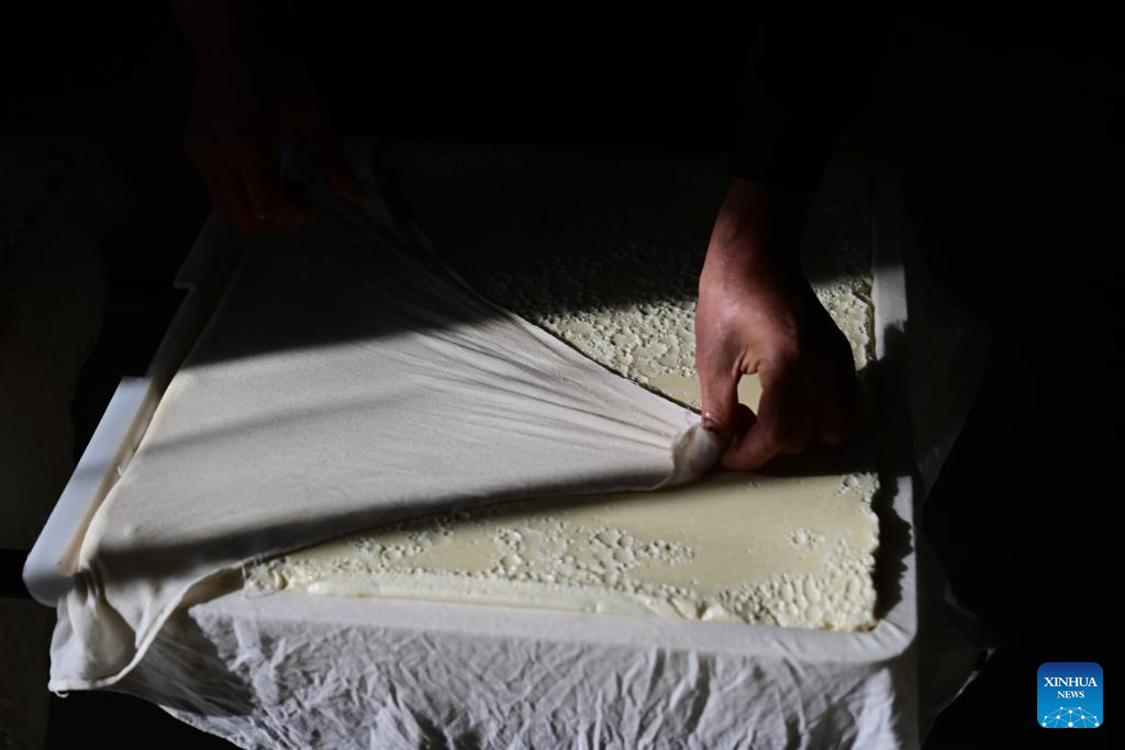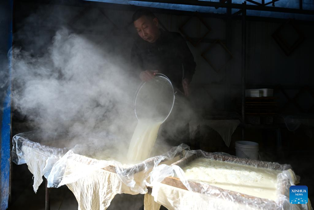 Hu Xuebing, a provincial intangible cultural heritage representative inheritor of the traditional tofu making skills, makes tofu at Daquan Village in Shouxian County, Huainan City, east China's Anhui Province, Jan. 15, 2025. For thousands of years, the traditional tofu-making techniques have been carried on from generation to generation in Bagongshan Township of Shouxian County. This technique in 2014 was included in the fourth batch of the national representative list of intangible cultural heritage of China.