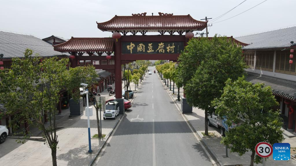 A drone photo taken on April 8, 2025 shows a view of Daquan Village of Bagongshan Township in Shouxian County, Huainan City, east China's Anhui Province. For thousands of years, the traditional tofu-making techniques have been carried on from generation to generation in Bagongshan Township of Shouxian County. This technique in 2014 was included in the fourth batch of the national representative list of intangible cultural heritage of China.