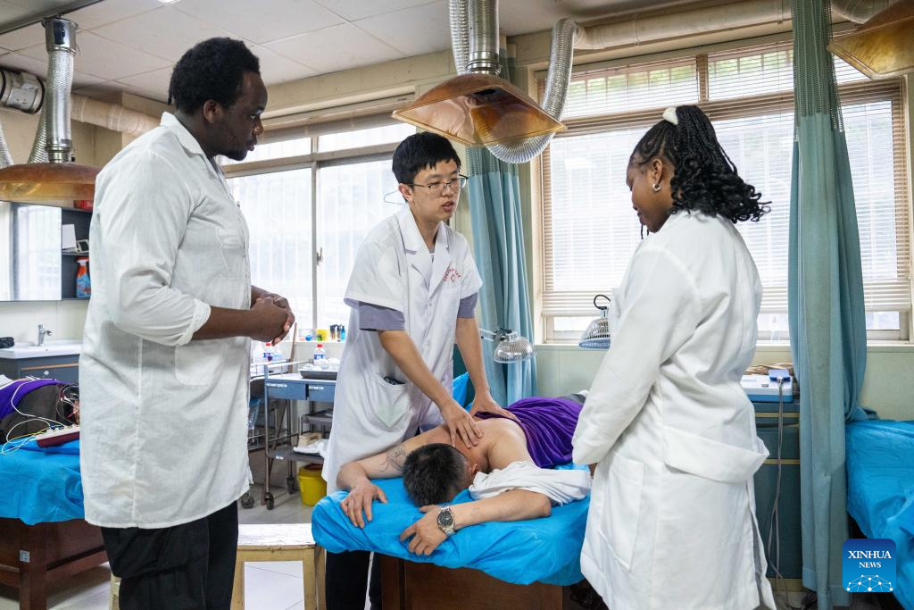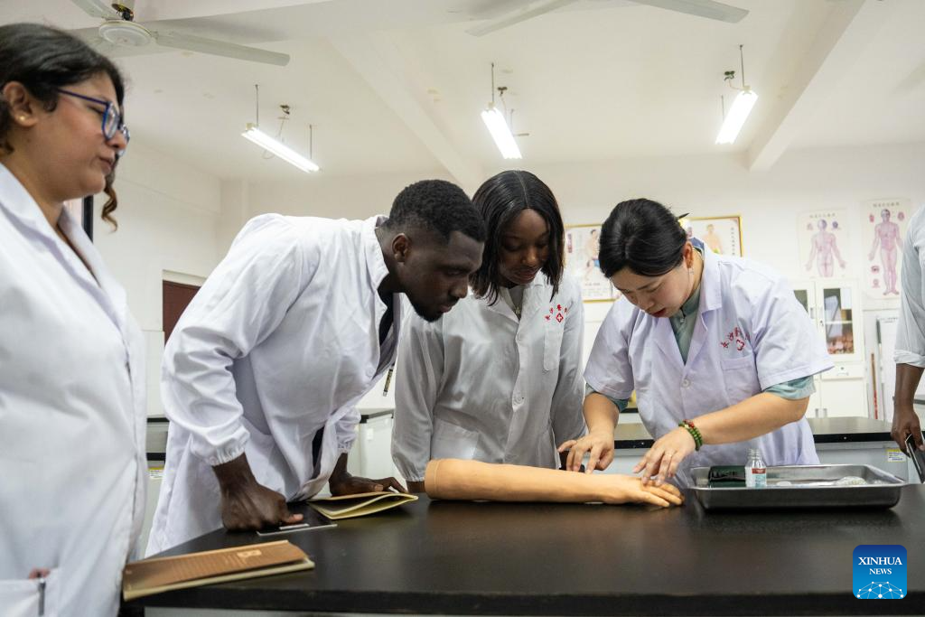 The school promotes cultural exchange globally while popularizing traditional Chinese medicine through courses including surgery, medicine, acupuncture, and tuina (therapeutic massage). (Xinhua/Chen Sihan)