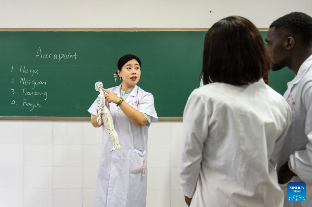 Teacher Ding Le (1st L) gives a class on acupuncture to international students at Changsha Medical University in Changsha, central China's Hunan Province, June 19, 2025.