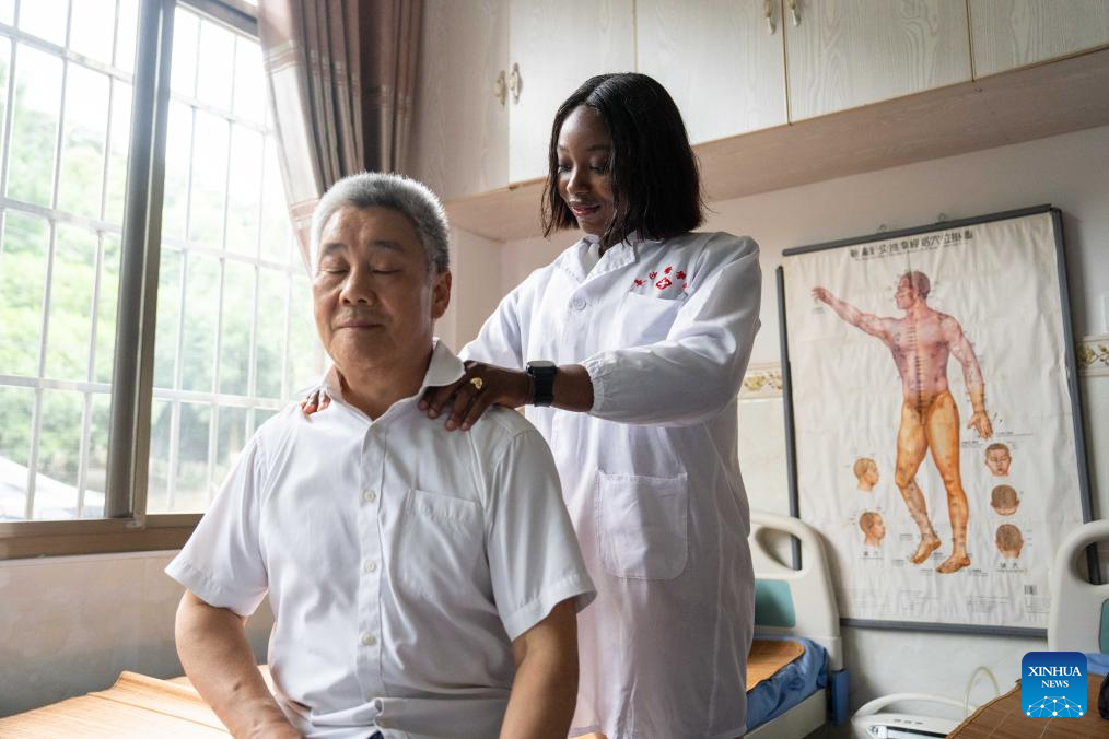 International student Ekpene Mabel Solomon (1st R) from Nigeria and Ng'onga Chiyumbe Kachinga (1st L) from Zambia learn about massage therapy at the first affiliated hospital of Changsha Medical University in Changsha, central China's Hunan Province, June 18, 2025.