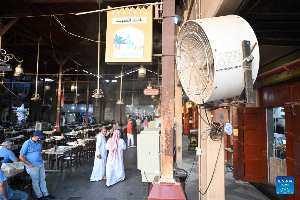 This photo taken on June 18, 2025 shows electric fans installed with water sprays for cooling in Kuwait City, Kuwait. Kuwait experienced an intense heatwave in recent days. (Photo by Asad/Xinhua)