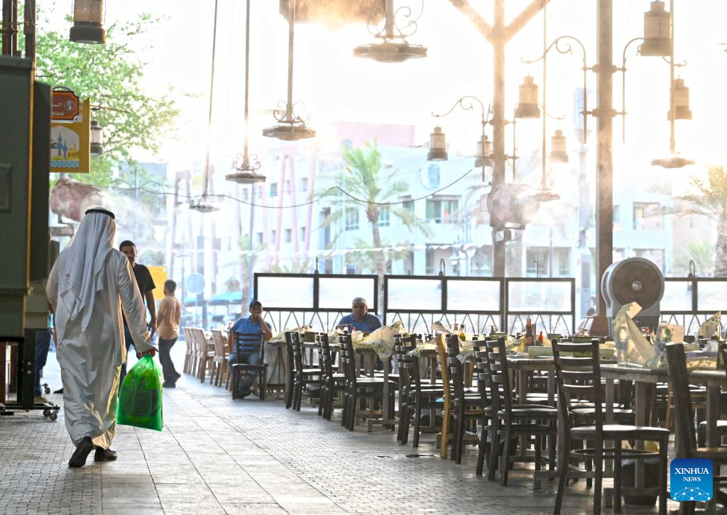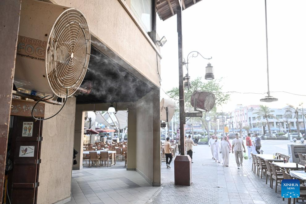 People walk by electric fans installed with water sprays for cooling in Kuwait city, Kuwait on June 18, 2025. Kuwait experienced an intense heatwave in recent days. (Photo by Asad/Xinhua)