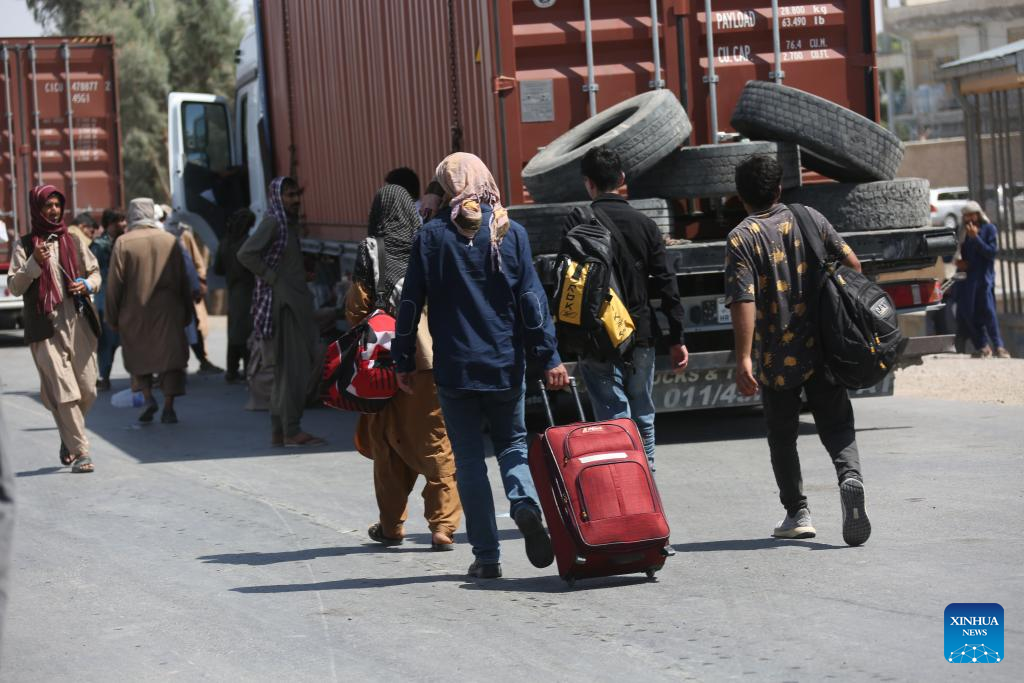 Afghan returnees carry their belongings across the Pul-e-Abresham border crossing in western Nimroz province, Afghanistan, June 17, 2025. (Photo by SaifurahmanSafi/Xinhua)