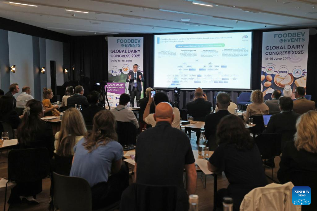 This photo taken on June 18, 2025 shows a scene during the 18th Global Dairy Congress in Amsterdam, the Netherlands. Laurence Rycken, director general of the International Dairy Federation (IDF), has praised China's progress in dairy innovation and scientific research, highlighting the complementarity and strong potential for deeper collaboration between the Chinese and European diary industries.(Xinhua/Zhao Dingzhe)