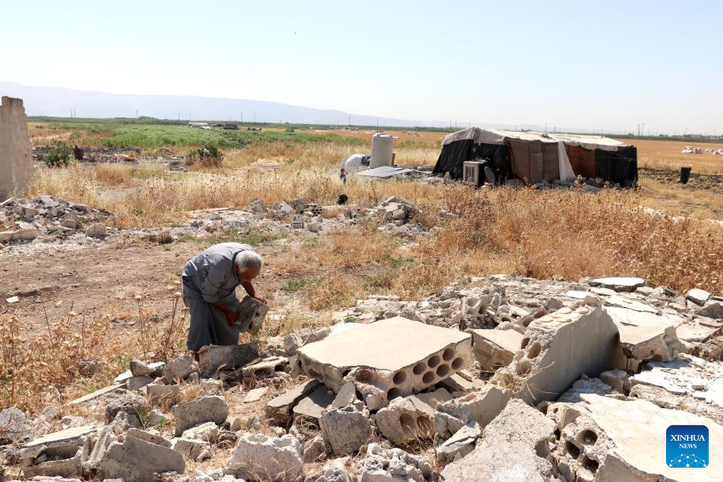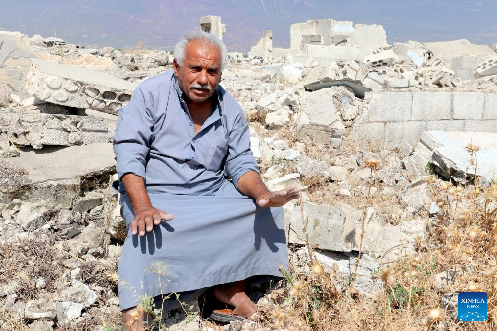 Akram Mahmoud al-Shehada, a returning Syrian refugee, stands in front of the rubble of his destroyed house in Qabr Fiddah, Hama province, central Syria, on June 19, 2025. After 14 years of displacement in Jordan, al-Shehada returned earlier this year to the ruins of his village, Qabr Fiddah, near Qalaat al-Madiq in Syria's central Hama province. His stone house, built brick by brick over decades of labor, was flattened during the war. Yet instead of despair, he chose to stay and start over. (Str/Xinhua)