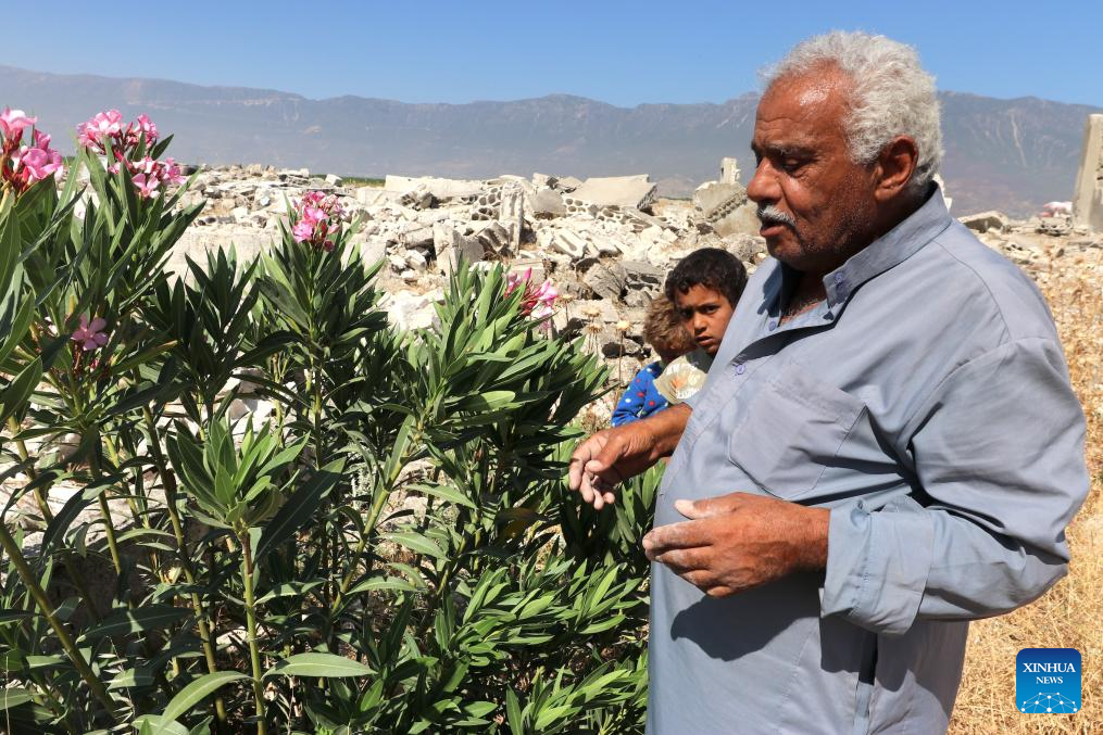 Akram Mahmoud al-Shehada, a returning Syrian refugee, tends to flowering shrubs near the rubble of his destroyed house in Qabr Fiddah, Hama province, central Syria, on June 19, 2025. After 14 years of displacement in Jordan, al-Shehada returned earlier this year to the ruins of his village, Qabr Fiddah, near Qalaat al-Madiq in Syria's central Hama province. His stone house, built brick by brick over decades of labor, was flattened during the war. Yet instead of despair, he chose to stay and start over. (Str/Xinhua)