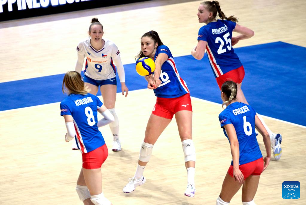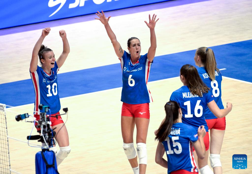 Players of the Czech Republic celebrate scoring during the Pool 5 match between Bulgaria and the Czech Republic at the Women's Volleyball Nations League (VNL) 2025 in Hong Kong, south China, June 20, 2025. (Xinhua/Lo Ping Fai)
