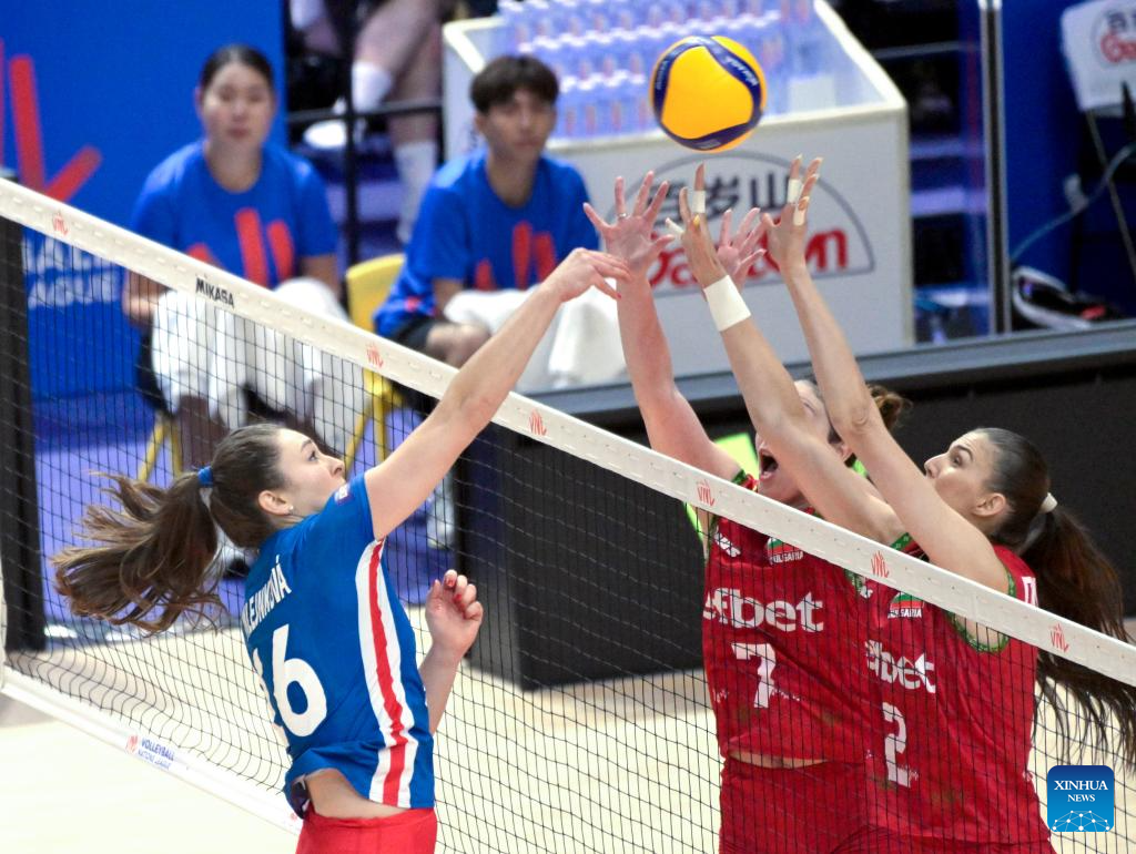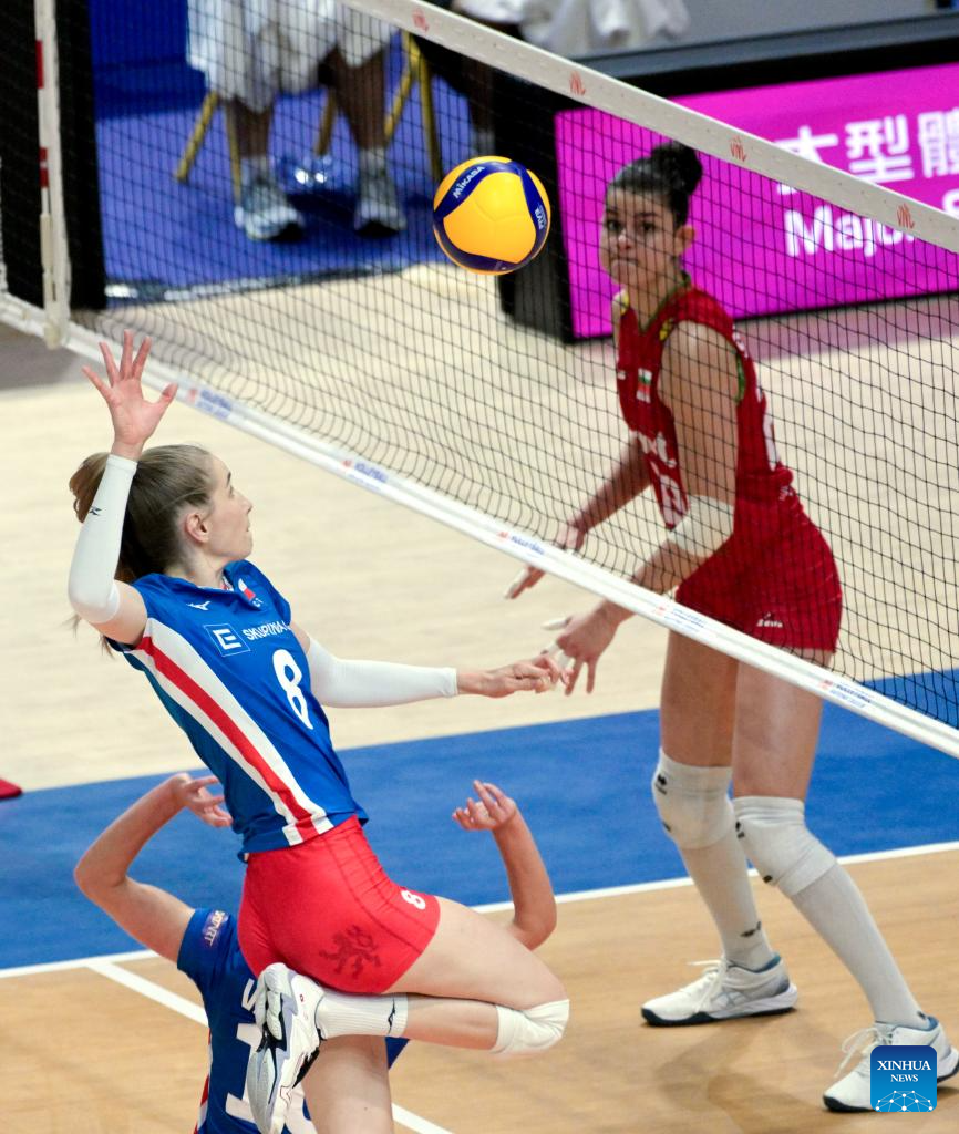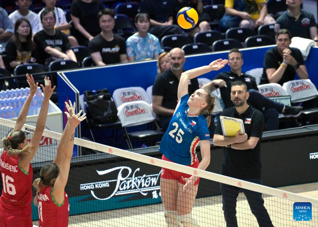 Monika Brancuska (R) of the Czech Republic spikes the ball during the Pool 5 match between Bulgaria and the Czech Republic at the Women's Volleyball Nations League (VNL) 2025 in Hong Kong, south China, June 20, 2025. (Xinhua/Lo Ping Fai)