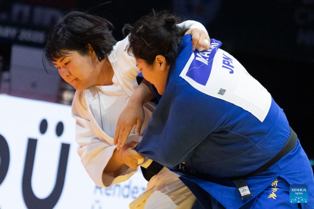Kim Hayun (L) of South Korea competes with Arai Mao of Japan during the women's +78kg final at the IJF Judo World Championships 2025 in Budapest, Hungary on June 19, 2025. (Photo by Attila Volgyi/Xinhua)