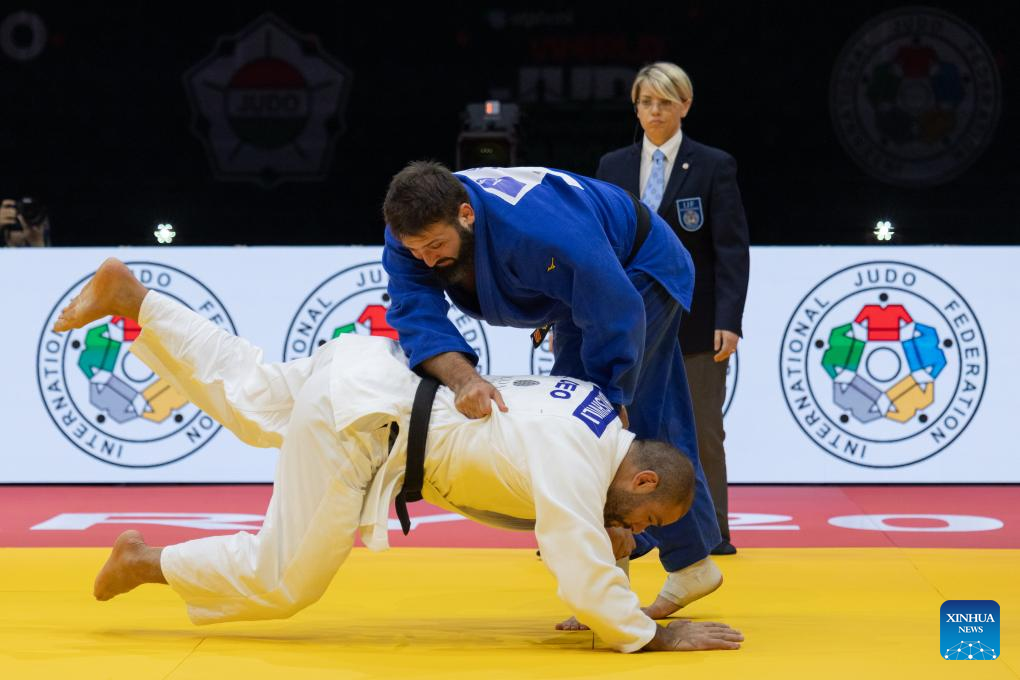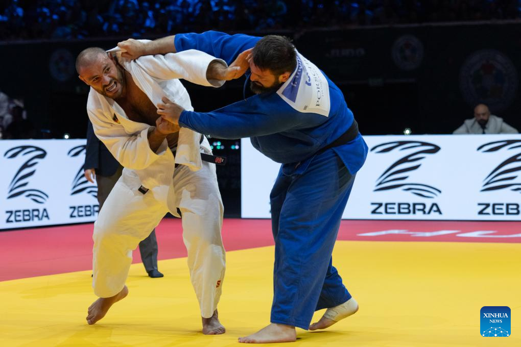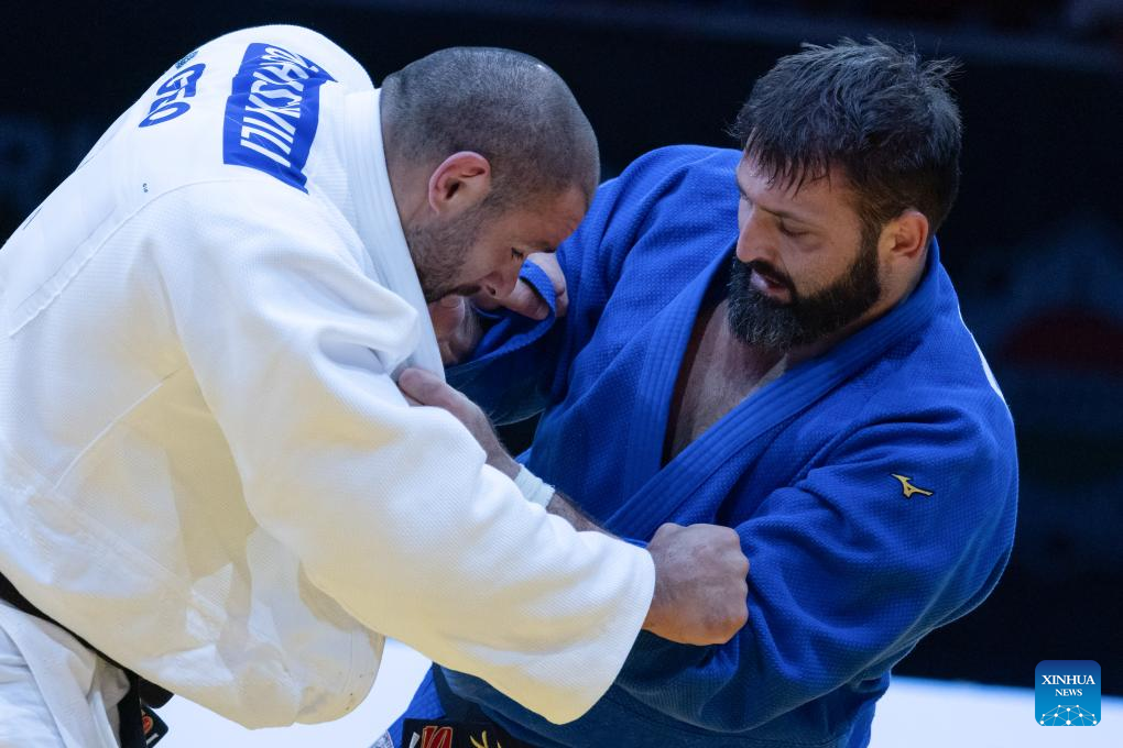 Inal Tasoev (L) from neutral athletes of the International Judo Federation (IJF) and Guram Tushishvili of Georgia compete during the men's +100kg final at the IJF Judo World Championships 2025 in Budapest, Hungary, June 19, 2025. (Photo by Attila Volgyi/Xinhua)