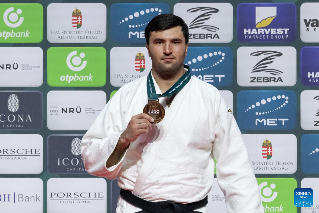 Gold medalist Inal Tasoev from neutral athletes of the International Judo Federation (IJF) poses during the awarding ceremony for the men's +100kg event at the IJF Judo World Championships 2025 in Budapest, Hungary, June 19, 2025. (Photo by Attila Volgyi/Xinhua)