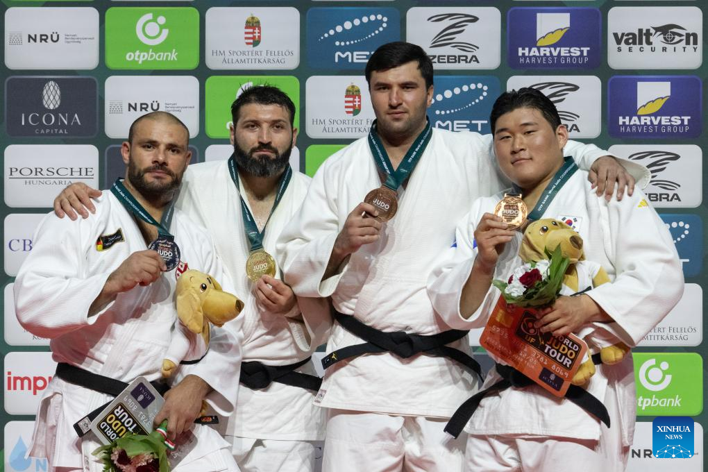 Silver medalist Guram Tushishvili (1st L) of Georgia, gold medalist Inal Tasoev (2nd L) from neutral athletes of the International Judo Federation (IJF), bronze medalists Temur Rakhimov (2nd R) of Tajikistan and Kim Minjong of South Korea pose during the awarding ceremony for the men's +100kg event at the IJF Judo World Championships 2025 in Budapest, Hungary, June 19, 2025. (Photo by Attila Volgyi/Xinhua)