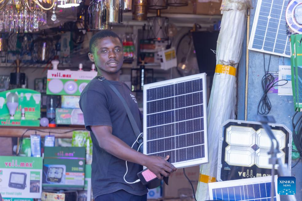A businessman displays photovoltaic equipment outside his shop in Buea, Southwest Region, Cameroon, on June 17, 2025. (Photo by Muleng Timngum/Xinhua)
