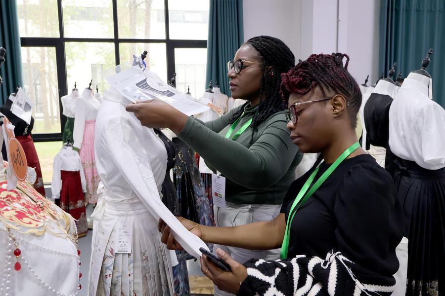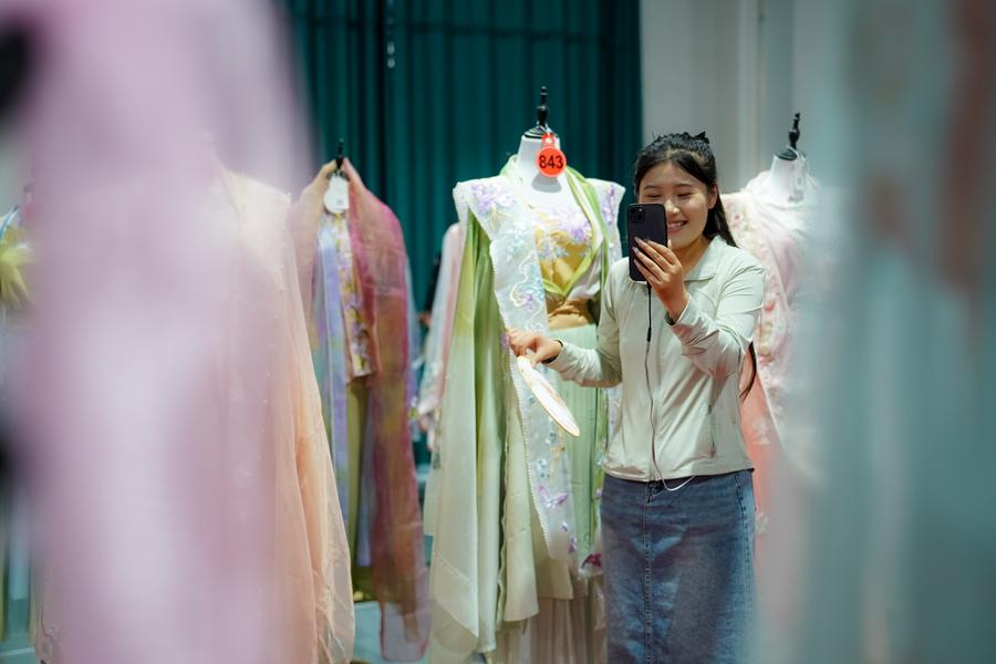 A participant of a training course hosted by China Woman's University views Hanfu at a digital economy industrial park in Caoxian County, east China's Shandong Province, June 19, 2025. (Xinhua/Guo Xulei)