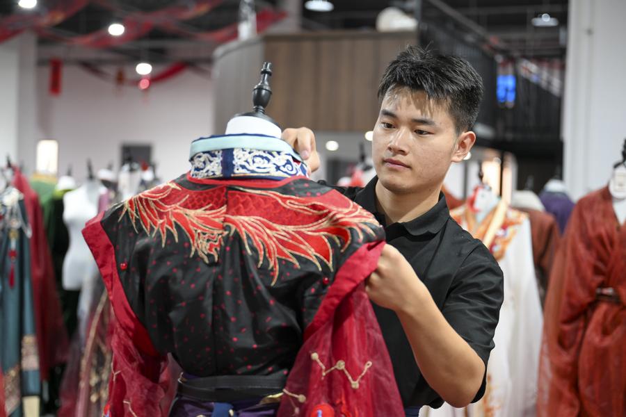 A participant of a training course hosted by China Woman's University tries on Hanfu attire at a Hanfu base in Caoxian County, east China's Shandong Province, June 19, 2025. (Xinhua/Guo Xulei)A participant of a training course hosted by China Woman's University selects Hanfu at a Hanfu base in Caoxian County, east China's Shandong Province, June 19, 2025. (Xinhua/Guo Xulei)A staff member works at a Hanfu design studio in Caoxian County, east China's Shandong Province, June 18, 2025. (Xinhua/Shao Zedong)A staff member monitors the work of embroidery machines in an embroidery enterprise in Caoxian County, east China's Shandong Province, June 19, 2025. (Xinhua/Xu Jiayi)A staff member designs patterns for horse-face skirt, or Mamianqun, at a Hanfu design studio in Caoxian County, east China's Shandong Province, June 18, 2025. (Xinhua/Xu Jiayi)A staff member works in front of a laser cutting equipment at a technology industrial park in Caoxian County, east China's Shandong Province, June 17, 2025. (Xinhua/Guo Xulei)A participant of a training course hosted by China Woman's University tries on Hanfu attire at a Hanfu base in Caoxian County, east China's Shandong Province, June 19, 2025. (Xinhua/Guo Xulei)Participants of a training course hosted by China Woman's University select Hanfu at a Hanfu base in Caoxian County, east China's Shandong Province, June 19, 2025. (Xinhua/Wang Yiliang)Participants of a training course hosted by China Woman's University select Hanfu at a Hanfu base in Caoxian County, east China's Shandong Province, June 19, 2025. (Xinhua/Wang Yiliang)An embroidery machine is seen at work in an embroidery enterprise in Caoxian County, east China's Shandong Province, June 19, 2025. (Xinhua/Shao Zedong)A staff member arranges Hanfu at a Hanfu base in Caoxian County, east China's Shandong Province, June 18, 2025. (Xinhua/Xu Jiayi)Models present Hanfu on the stage during a Hanfu launch event held at a digital economy industrial park in Caoxian County, east China's Shandong Province, April 10, 2025. (Xinhua/Guo Xulei)A staff member promotes Hanfu via livestreaming at a Hanfu base in Caoxian County, east China's Shandong Province, June 17, 2025.(Xinhua/Shao Zedong)■