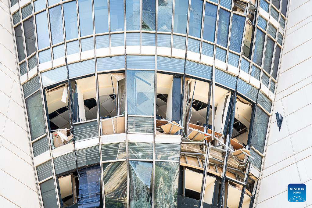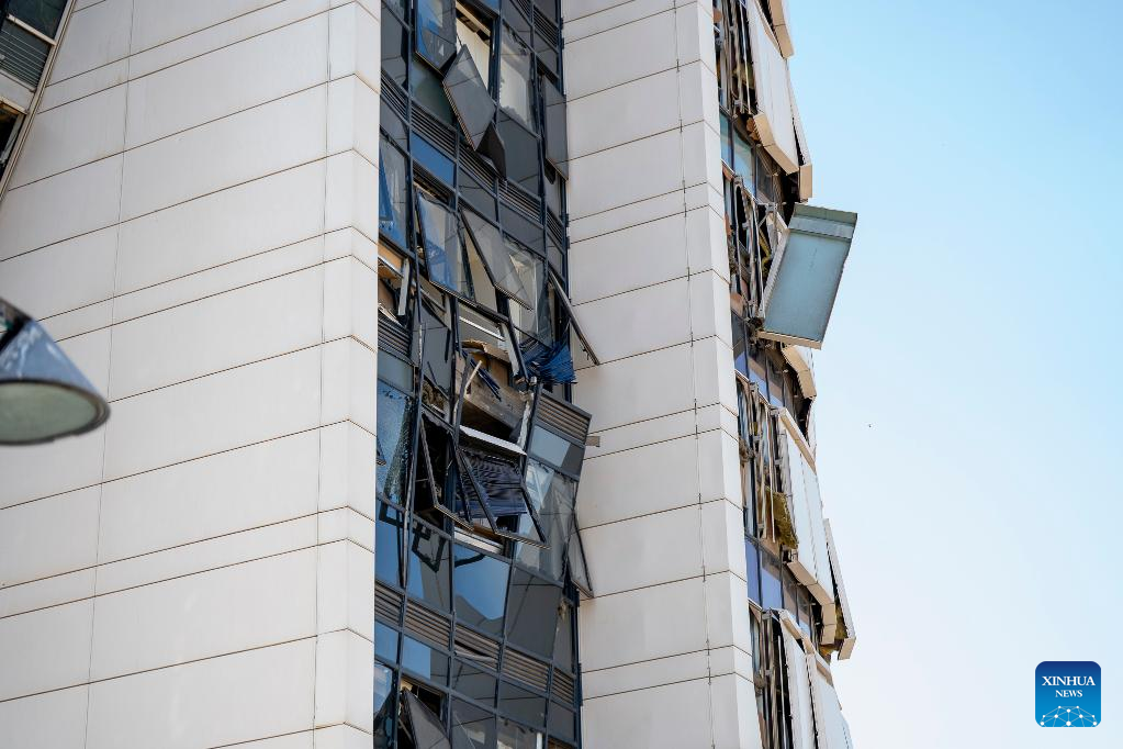 Photo taken on June 20, 2025 shows a damaged building in Haifa, northern Israel. A fresh barrage of missiles launched from Iran struck northern Israel on Friday, wounding 21 people and causing significant damage in the coastal city of Haifa, according to Israel's national emergency service Magen David Adom (MDA). (Miki Schauder/JINI via Xinhua)