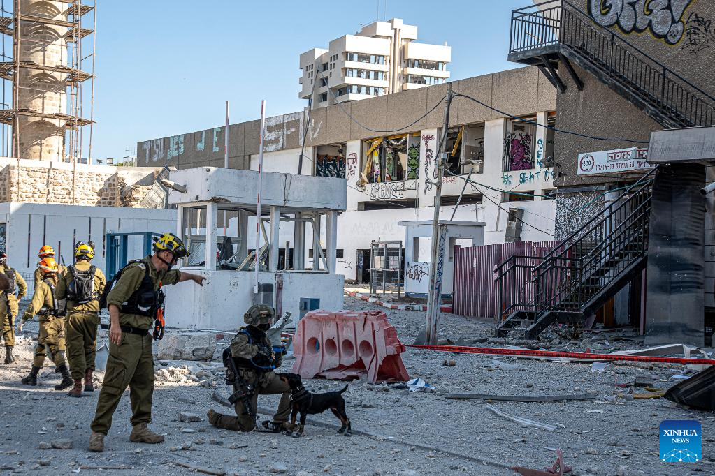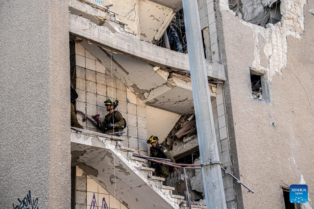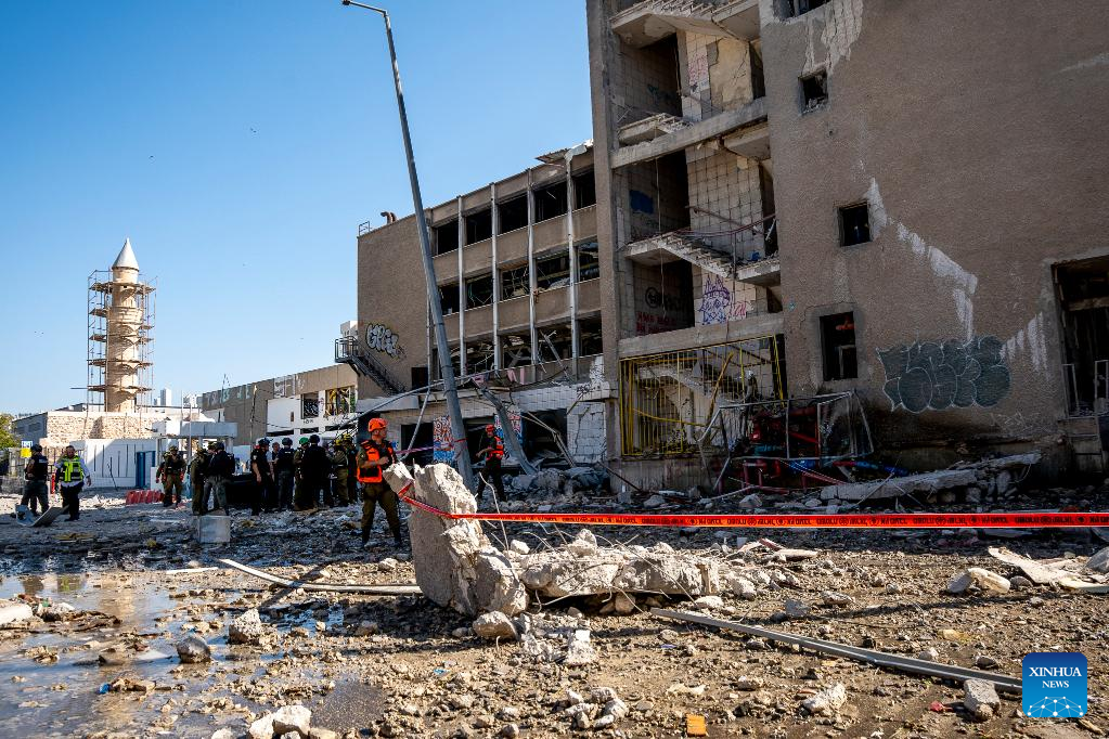 Israeli security and rescue forces work at the scene of a missile attack from Iran, in Haifa, northern Israel, on June 20, 2025. A fresh barrage of missiles launched from Iran struck northern Israel on Friday, wounding 21 people and causing significant damage in the coastal city of Haifa, according to Israel's national emergency service Magen David Adom (MDA). (Miki Schauder/JINI via Xinhua)