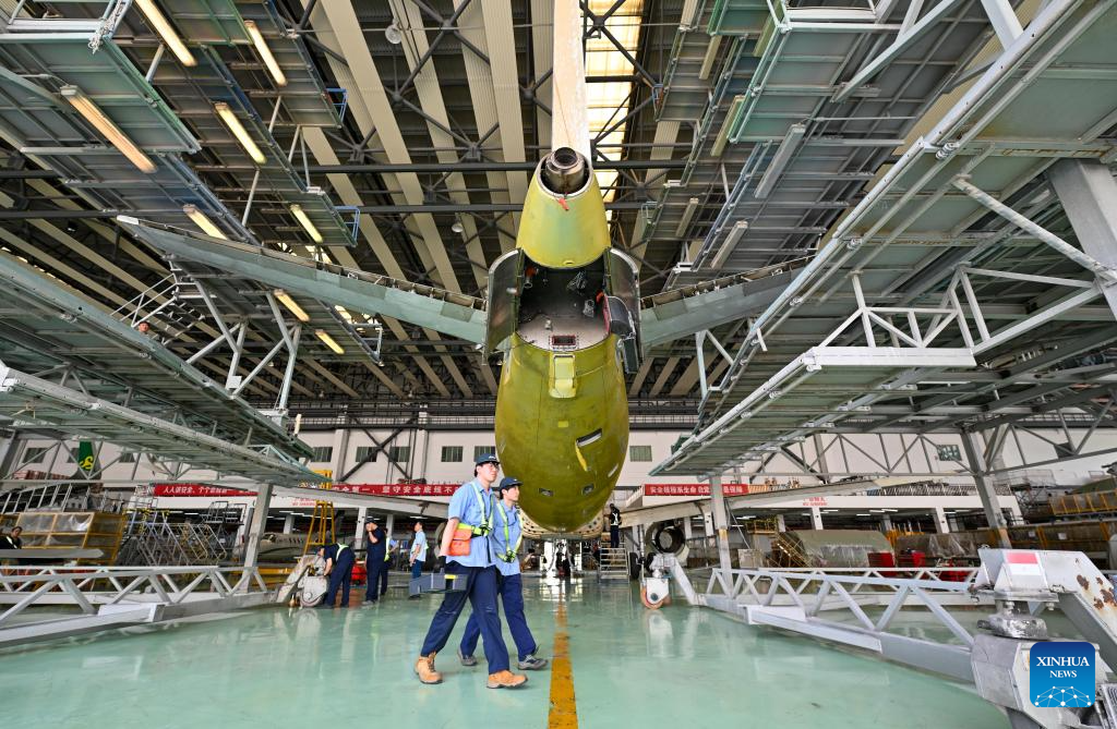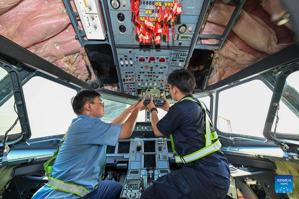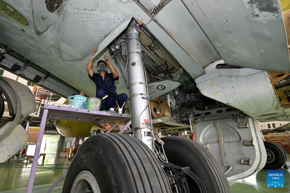 Staff member carry out maintenance on an airplane inside a hangar within the Tianjin Airport area in Tianjin Pilot Free Trade Zone (FTZ), north China's Tianjin, June 18, 2025. The Tianjin pilot FTZ was established in 2015. Over the past decade, the pilot FTZ in Tianjin municipality has yielded numerous achievements in institutional innovation.