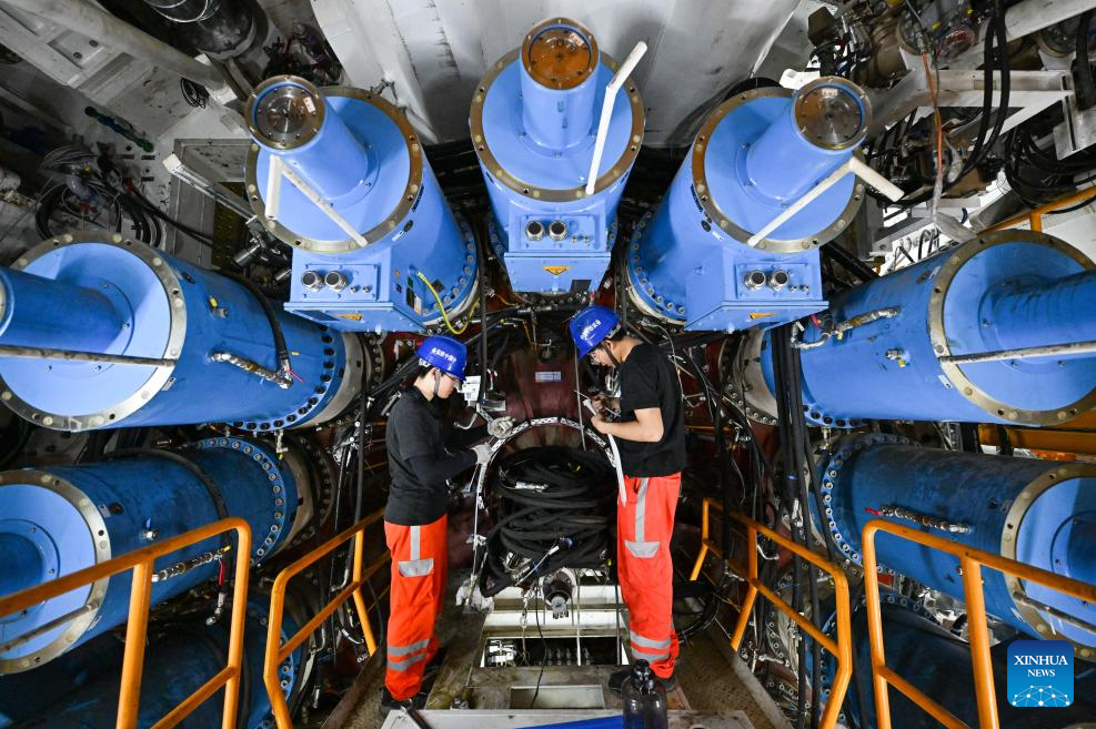 Staff members work inside a shield machine to be exported to Italy at Dongjiang port area in Tianjin Pilot Free Trade Zone (FTZ), north China's Tianjin, June 18, 2025. The Tianjin pilot FTZ was established in 2015. Over the past decade, the pilot FTZ in Tianjin municipality has yielded numerous achievements in institutional innovation.