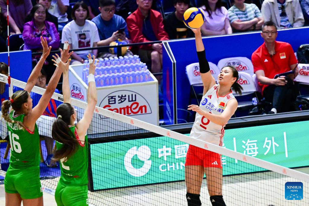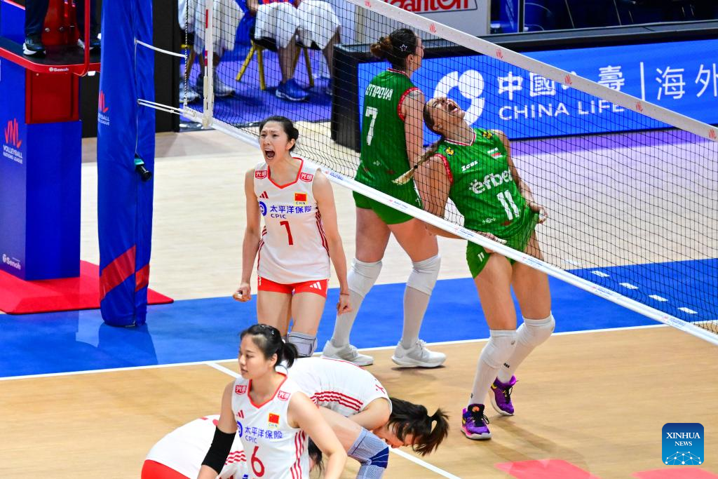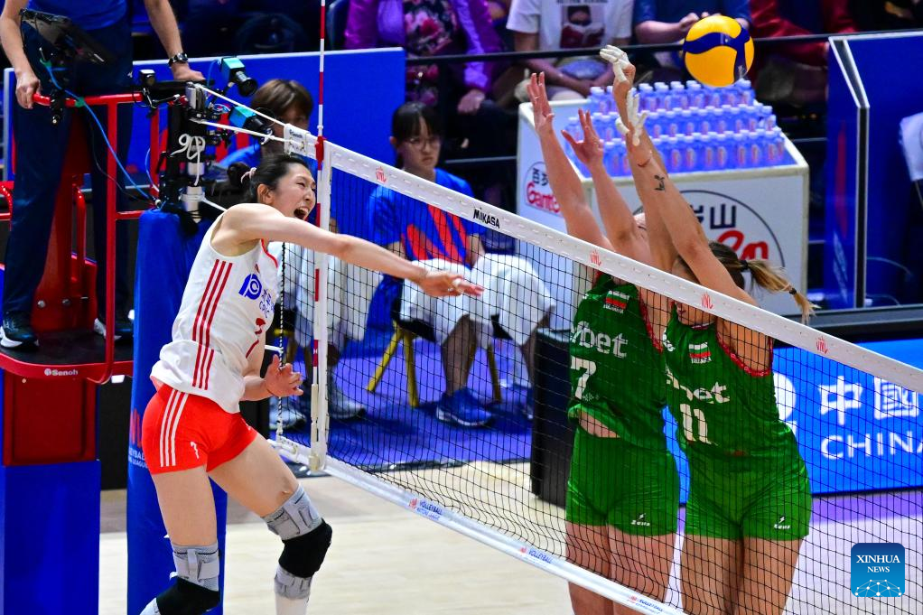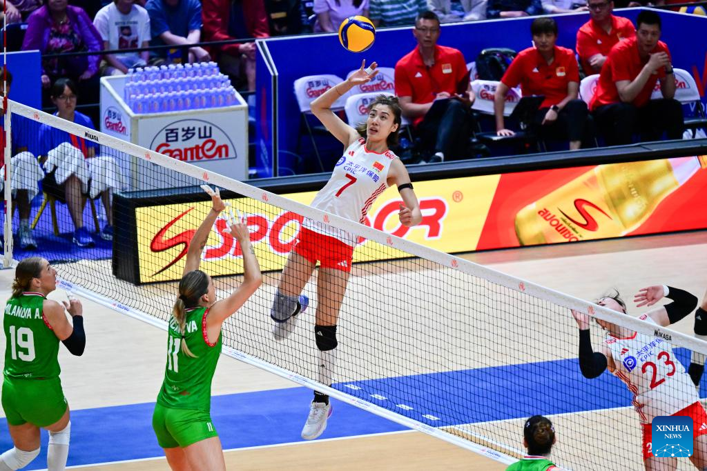 Wang Yuanyuan (2nd R) of China spikes the ball during the Pool 5 match between China and Bulgaria at the Women's Volleyball Nations League (VNL) 2025 in Hong Kong, south China, June 19, 2025. (Xinhua/Zhu Wei)