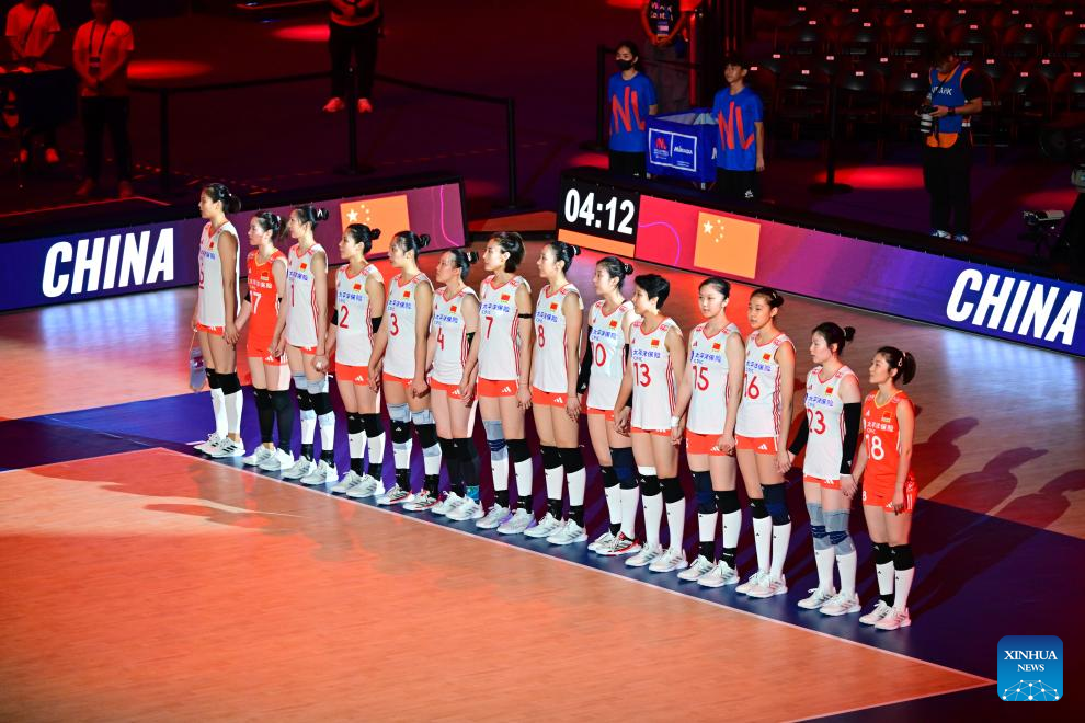 Players of China stand in line for the national anthem before the Pool 5 match between China and Bulgaria at the Women's Volleyball Nations League (VNL) 2025 in Hong Kong, south China, June 19, 2025. (Xinhua/Zhu Wei)