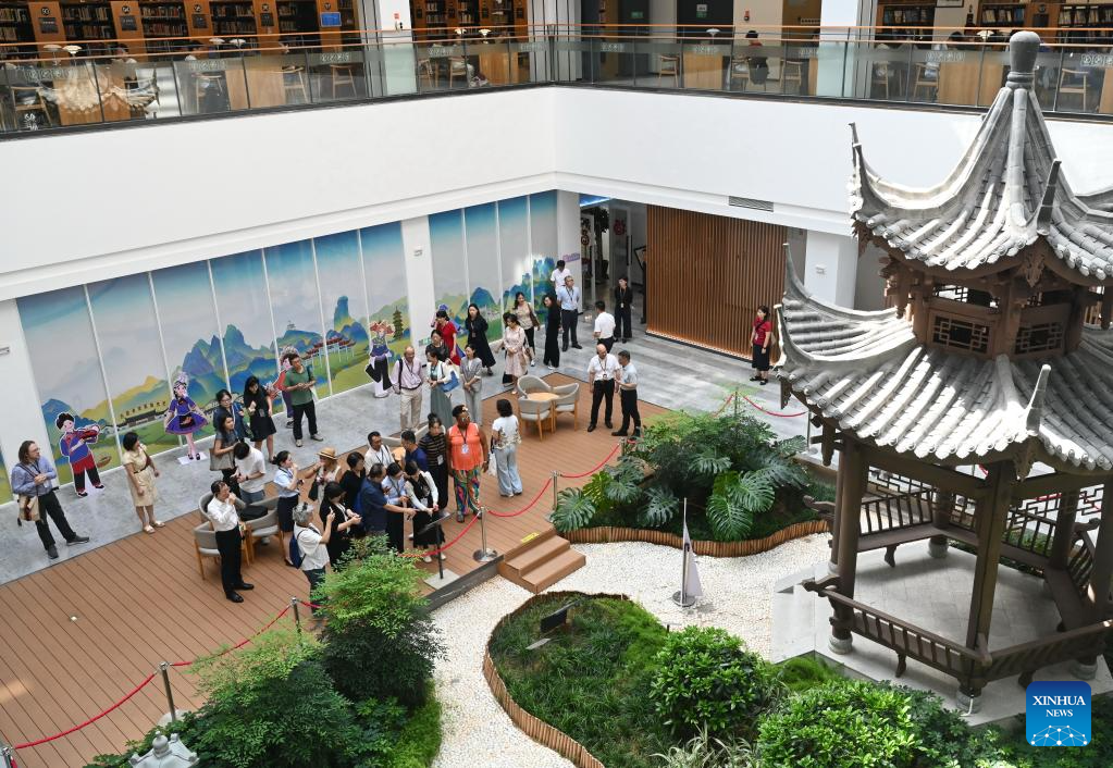 Librarians from China and abroad participating in an exchange program visit Fujian Provincial Library in Fuzhou, southeast China's Fujian Province, June 21, 2025. Participants of the event visited the innovative reading spaces of Fujian Provincial Library on Saturday to experience the achievements of local public cultural services. A seminar was also held to discuss cultural heritage and the sustainable development of libraries. (Xinhua/Lin Shanchuan)
