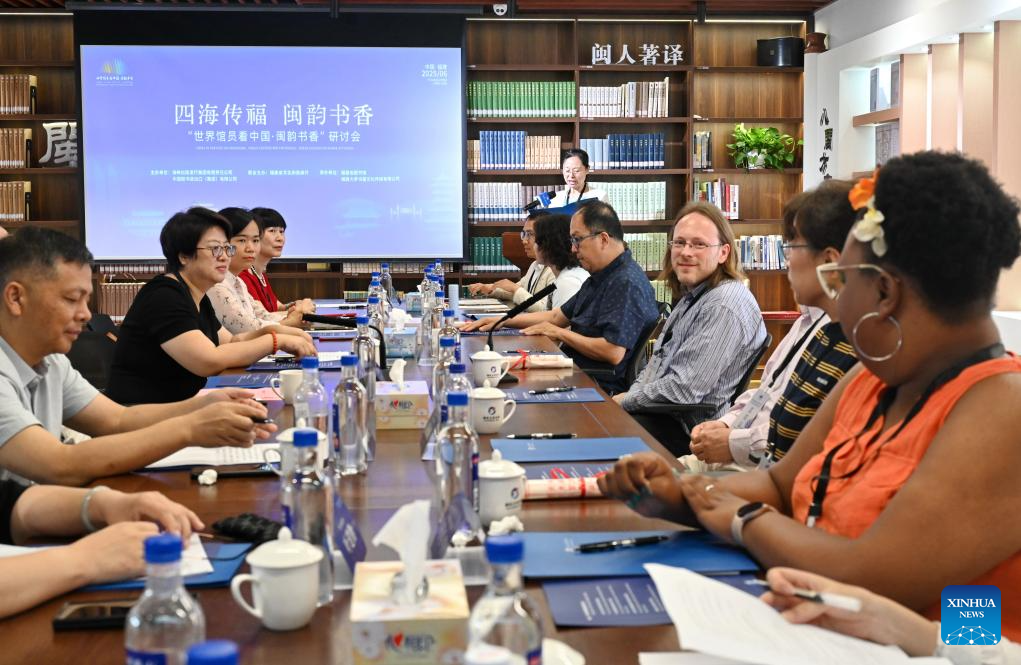 Librarians from China and abroad participating in an exchange program attend a seminar at Fujian Provincial Library in Fuzhou, southeast China's Fujian Province, June 21, 2025. Participants of the event visited the innovative reading spaces of Fujian Provincial Library on Saturday to experience the achievements of local public cultural services. A seminar was also held to discuss cultural heritage and the sustainable development of libraries. (Xinhua/Lin Shanchuan)