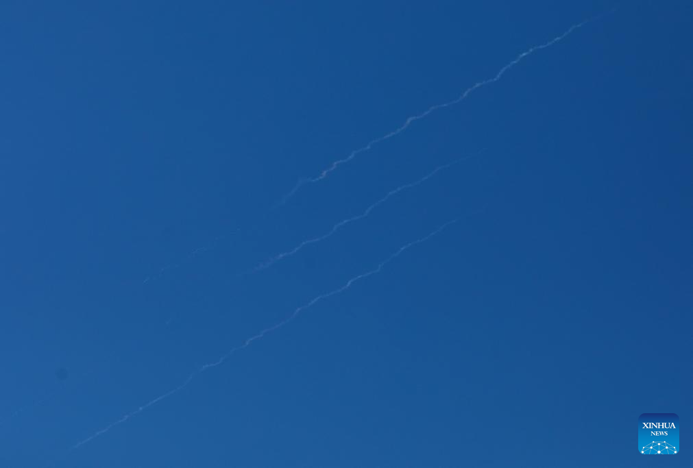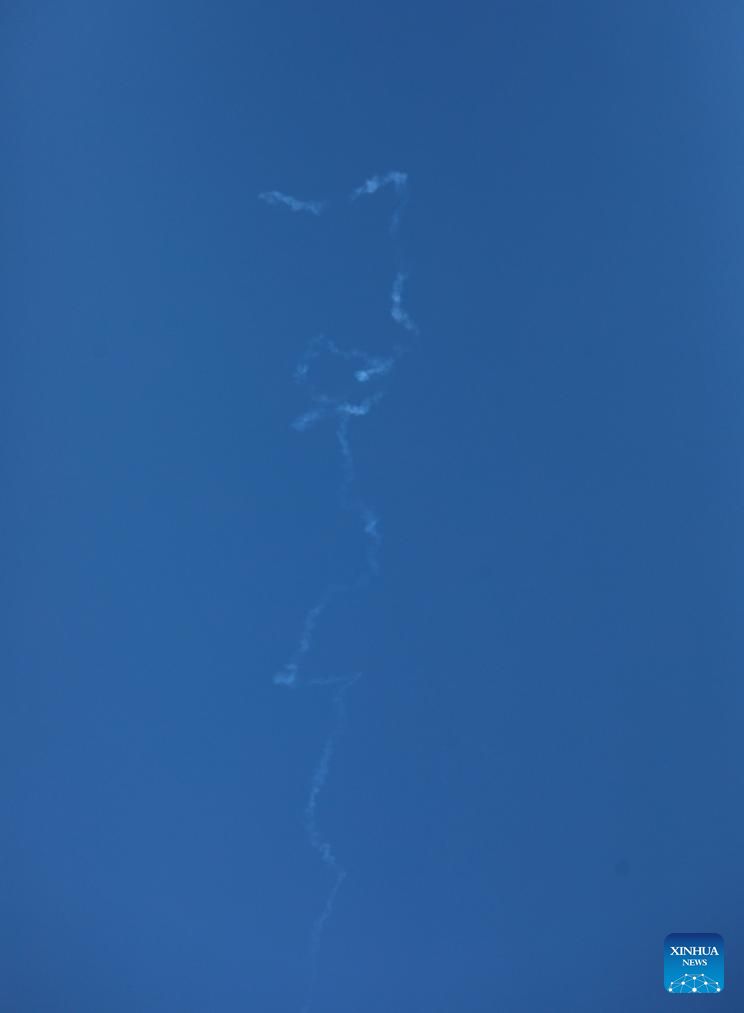 Missile traces are seen from the city of Nablus in the northern West Bank during Iran's missile attacks against Israel, on June 20, 2025. (Photo by Ayman Nobani/Xinhua)