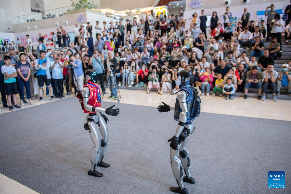Intelligent tour guide robots perform at the Inner Mongolia Museum in Hohhot, north China's Inner Mongolia Autonomous Region, June 20, 2025. The newly relocated Inner Mongolia Museum opened for trial operation on Friday in Hohhot. The new venue, covering an area of 147,000 square meters, has an exhibition area of 39,000 square meters. There are 10 basic exhibitions in the museum, showcasing more than 3,000 exhibits. The museum has introduced AI-powered holographic explanation, interactive digital heritage, robot tour, VR experience and other services to display the charm of culture. (Xinhua/Ma Jinrui)