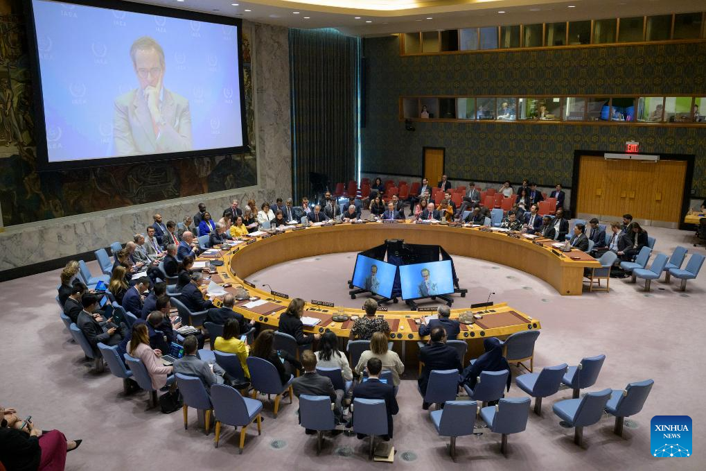 International Atomic Energy Agency (IAEA) Director General Rafael Grossi (on the screen) speaks via a video link at an emergency meeting of the Security Council at the UN headquarters in New York, on June 20, 2025. Grossi on Friday warned of the risk of nuclear contamination from Israeli attacks on Iranian nuclear facilities. (Manuel Elias/UN Photo/Handout via Xinhua)