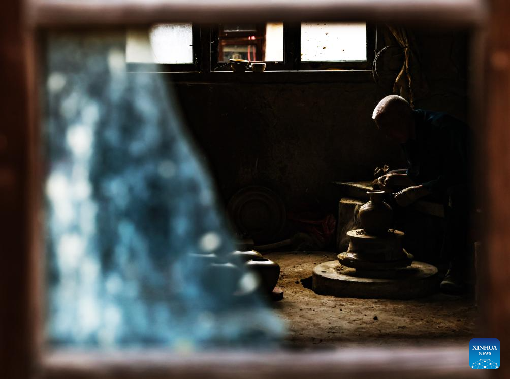 Fang Liangsheng, a pottery artisan, makes a piece of pottery in Pule Town, Guidong County, central China's Hunan Province, June 17, 2025. Pule Town boasts a rich history of pottery production. Artisans in the town follow the traditional clay pottery production technique and develop a series of new products, bringing new vitality to the crafts. (Photo by Lan Hongguang/Xinhua)