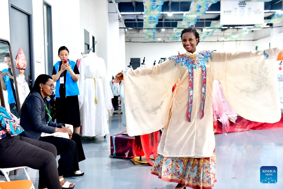 A participant of a training course hosted by China Woman's University tries on Hanfu attire at a Hanfu base in Caoxian County, east China's Shandong Province, June 19, 2025. Caoxian County in Shandong Prvince has leveraged its e-commerce foundation to build itself into a global center for Hanfu, China's traditional attire. The county has built a complete industrial chain spanning design, manufacturing, copyright protection, and digital marketing.