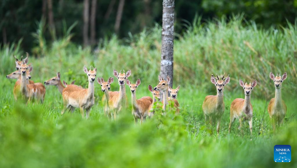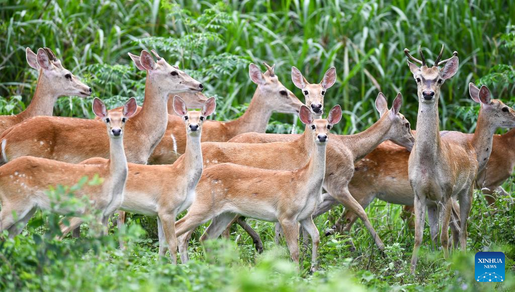 This photo taken on June 17, 2025 shows a group of Hainan Eld's deer at the Bangxi provincial nature reserve in Baisha Li Autonomous County, south China's Hainan Province. The Hainan Eld's deer, which is native to Hainan, is a national first-class protected animal and is categorized as endangered by the International Union for Conservation of Nature.