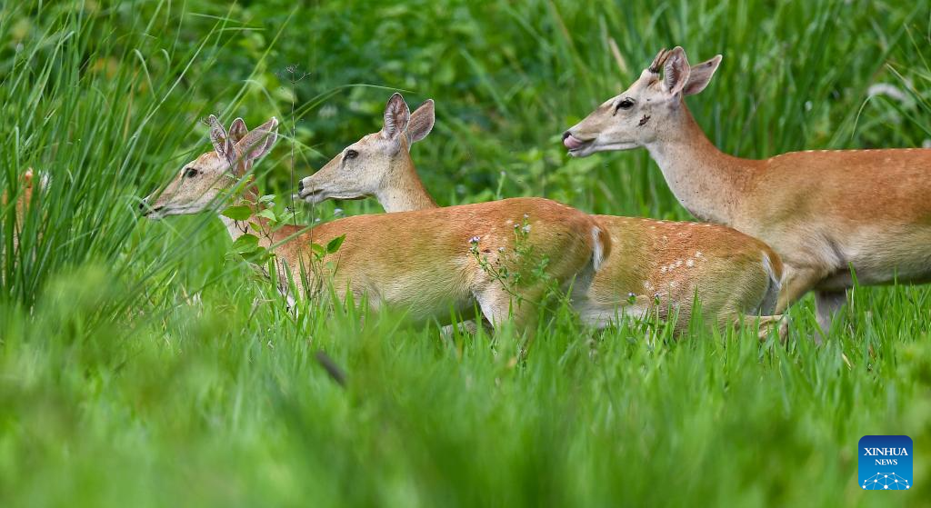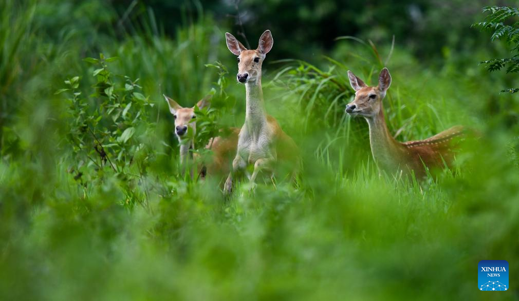 This photo taken on June 17, 2025 shows Hainan Eld's deer at the Bangxi provincial nature reserve in Baisha Li Autonomous County, south China's Hainan Province. The Hainan Eld's deer, which is native to Hainan, is a national first-class protected animal and is categorized as endangered by the International Union for Conservation of Nature.