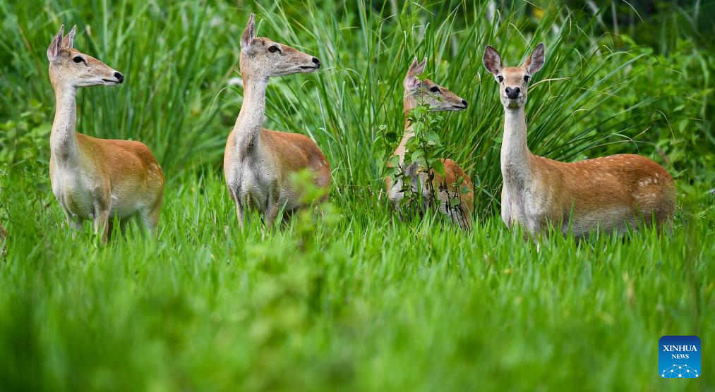 This photo taken on June 18, 2025 shows Hainan Eld's deer at the Bangxi provincial nature reserve in Baisha Li Autonomous County, south China's Hainan Province. The Hainan Eld's deer, which is native to Hainan, is a national first-class protected animal and is categorized as endangered by the International Union for Conservation of Nature.