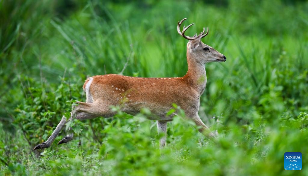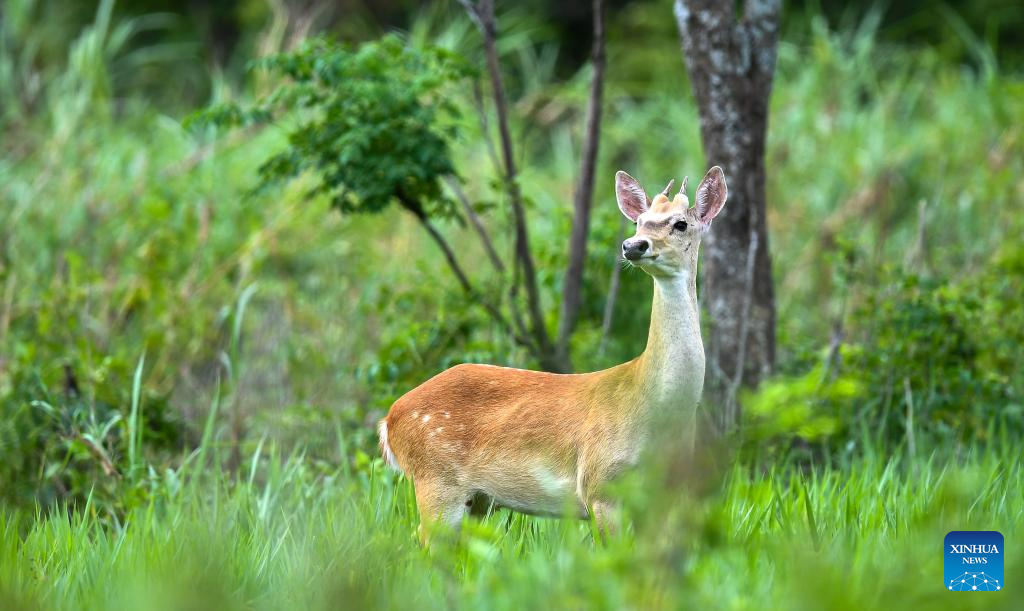 This photo taken on June 18, 2025 shows a Hainan Eld's deer at the Bangxi provincial nature reserve in Baisha Li Autonomous County, south China's Hainan Province. The Hainan Eld's deer, which is native to Hainan, is a national first-class protected animal and is categorized as endangered by the International Union for Conservation of Nature.